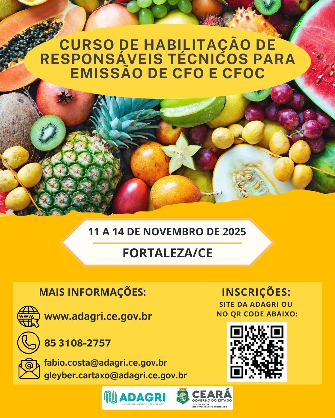 A Agência de Defesa Agropecuária do Estado do Ceará (Adagri), vinculada à Secretaria do Desenvolvimento Econômico (SDE), está com inscrições abertas para o Curso de Habilitação de Responsáveis Técnicos para Emissão de Certificado Fitossanitário de Origem (CFO) e Certificado Fitossanitário de Origem Consolidado (CFOC).