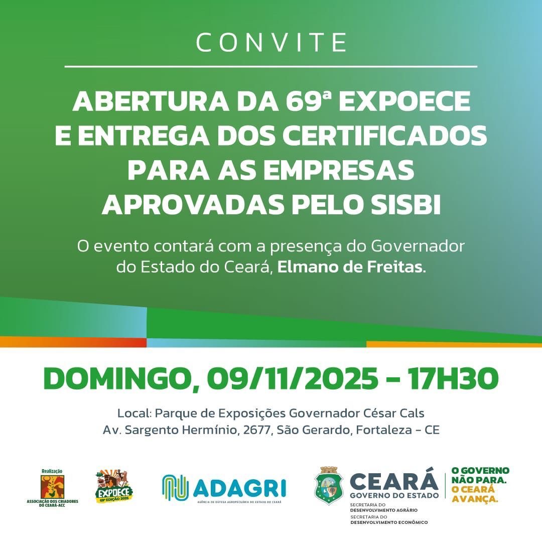 Neste domingo (09), o governador Elmano de Freitas anuncia a adesão de 5 empresas cearenses ao Sistema Brasileiro de Inspeção de Produtos de Origem Animal (Sisbi). A certificação será entregue durante a solenidade de abertura da Exposição Agropecuária e Industrial do Estado do Ceará (Expoece), neste domingo, às 18h, no Parque de Exposições Governador César Cals, em Fortaleza.