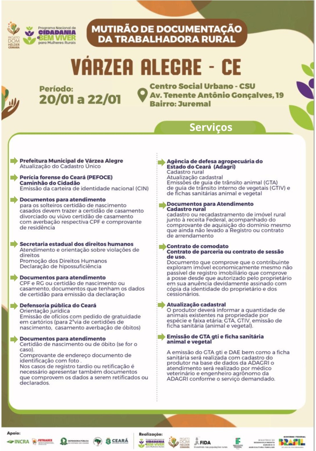 Começa nesta terça-feira (20) a primeira edição de 2026 do Mutirão de Documentação da Trabalhadora Rural. O evento acontece no município de Várzea Alegre, no Cariri, no Centro Social Urbano (CSU) – R. Francisco G. Majela Lima – Juremal – e prossegue até quinta-feira (22).