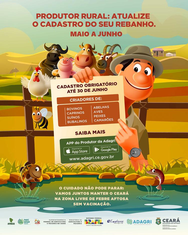 Atenção produtores, começa nesta segunda-feira (04) a Campanha de Atualização Cadastral de rebanhos, coordenada pela Agência de Defesa Agropecuária do Estado do Ceará (Adagri), vinculada à Secretaria do Desenvolvimento Econômico (SDE), A Campanha se estende até dia 30 de junho e vale ressaltar que a obrigatoriedade da atualização cadastral é para todas as explorações pecuárias assim como para os produtores e propriedades rurais no estado do Ceará.